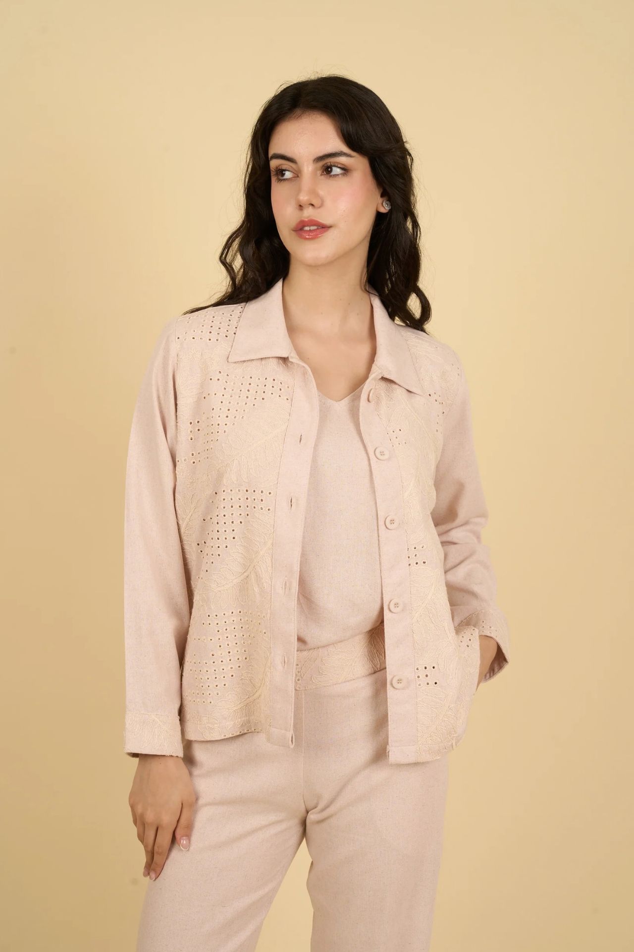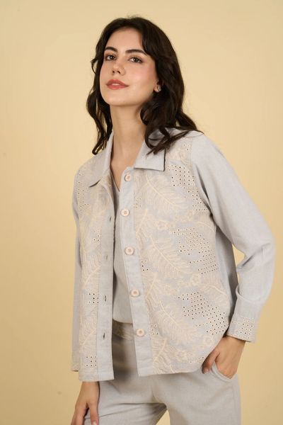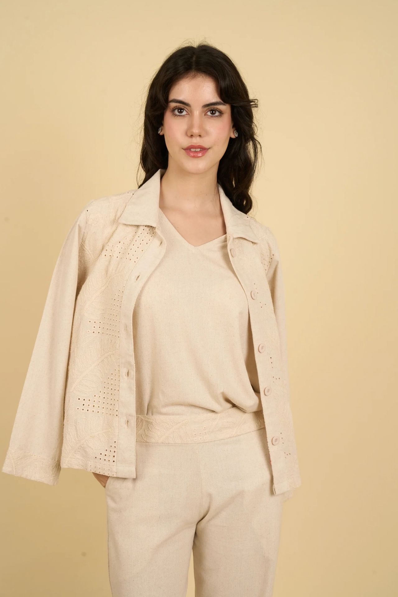 Confeccionado con una suave mezcla de algodón y poliéster. Su tela ofrece una ligera elasticidad y flexibilidad, adaptándose con gracia a tus movimientos sin sentirse rígida ni ajustada. Gracias a su textura ligera y respirable, es ideal para usar todo el día en cualquier estación.