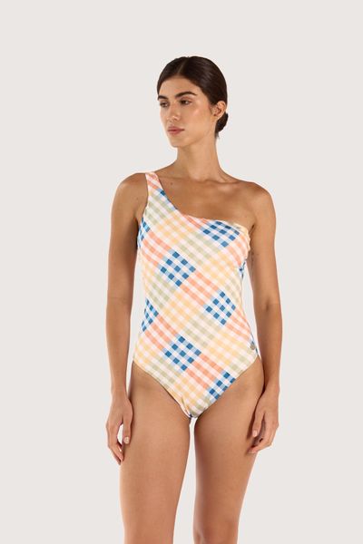 Enterizo con cortes y técnica de Color Block con aros fijos,almohadillas, tiras gruesas regulables y espalda con escote profundo.