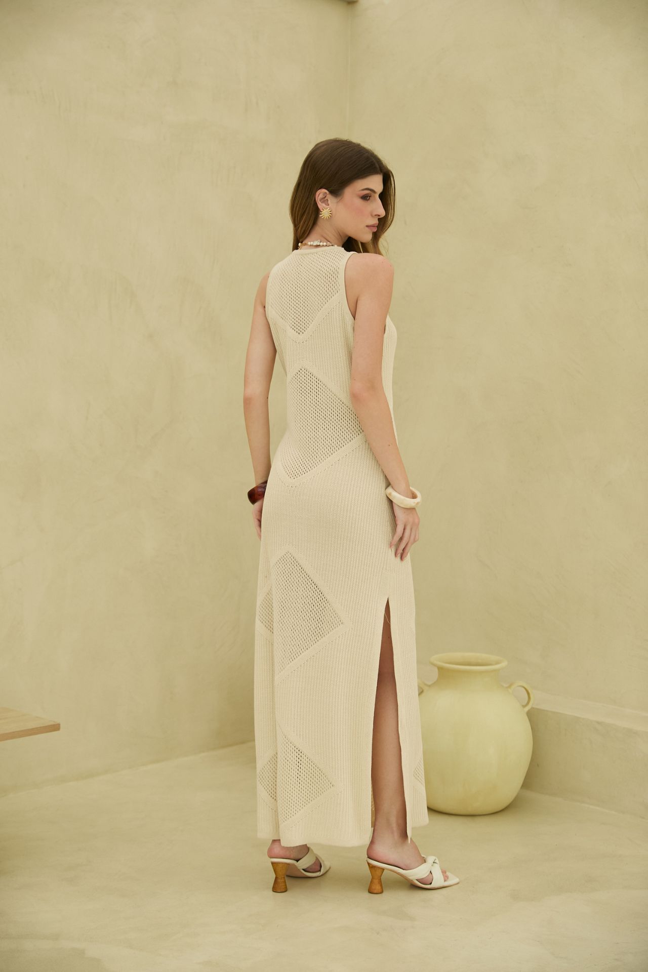 Maxi vestido manga cero fabricado en cotton mix, con aberturas laterales y detalles de calado. La talla standard puede ajustarse hasta un jean talla 30 o de bra hasta una talla 36B