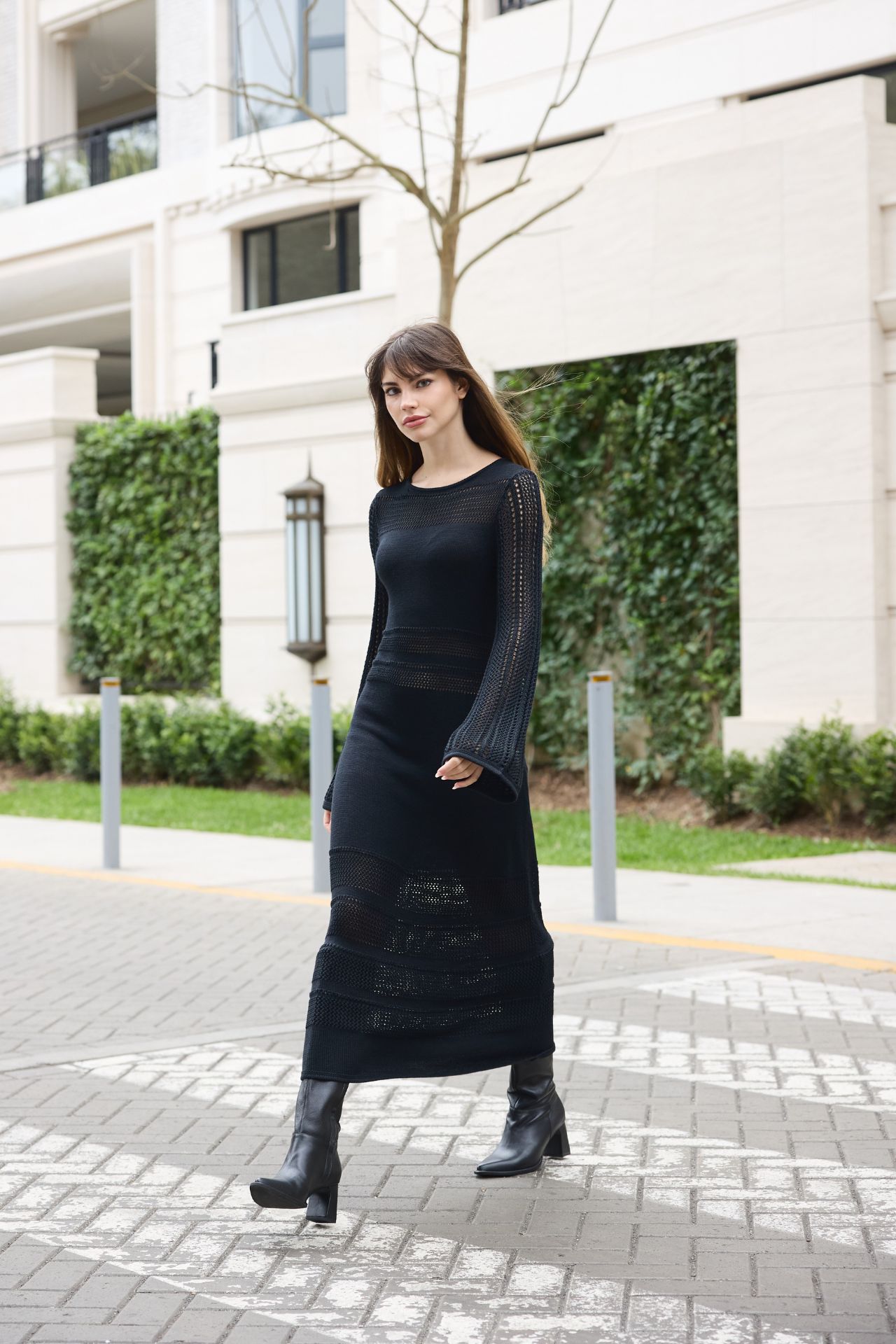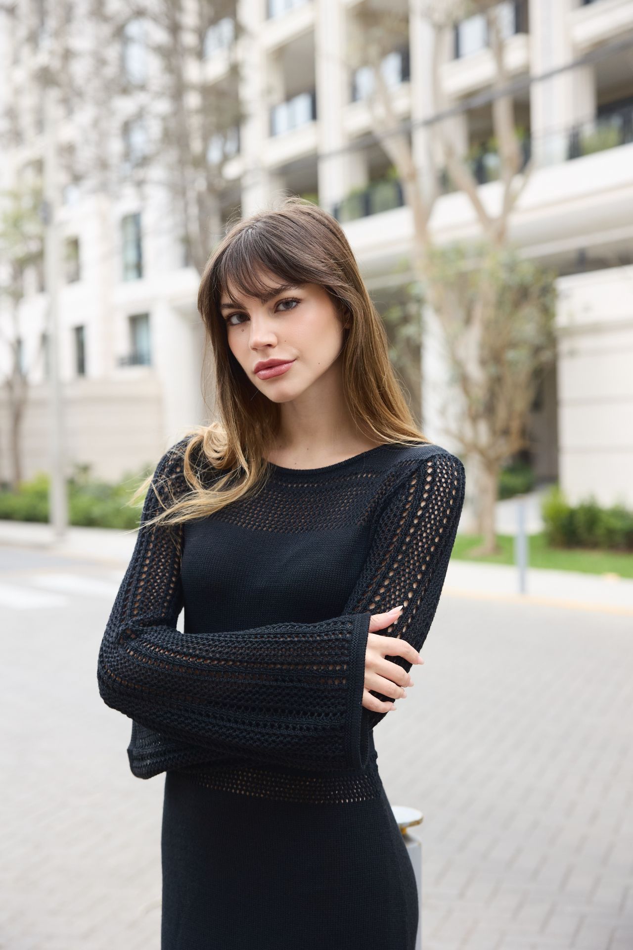 Vestido tejido negro con un fit suelto que acentúa muy bien la figura de todas. Detalles de calado en la cintura, mangas y basta. Mangas acampanadas para dar un look increíble y atemporal!