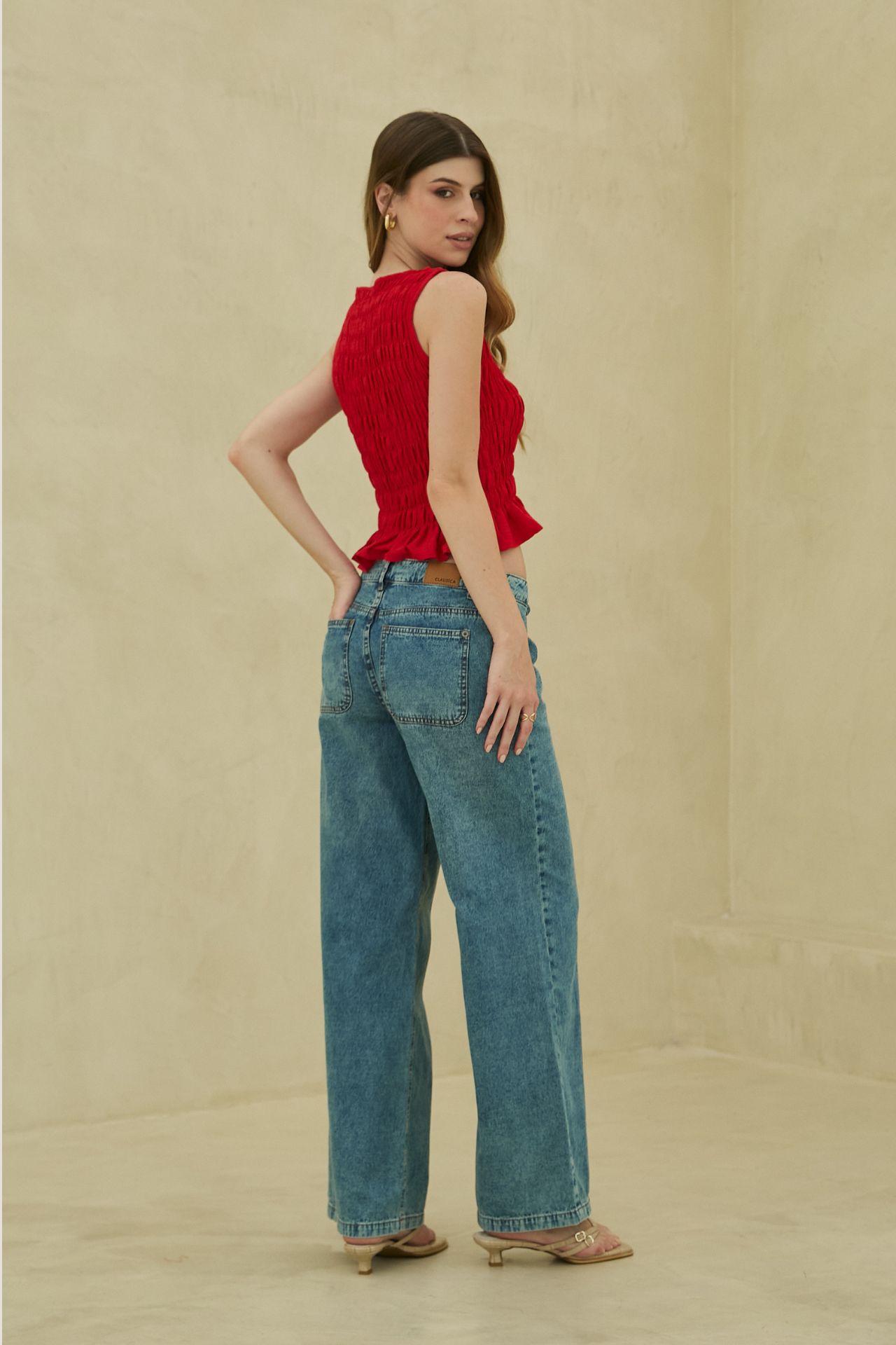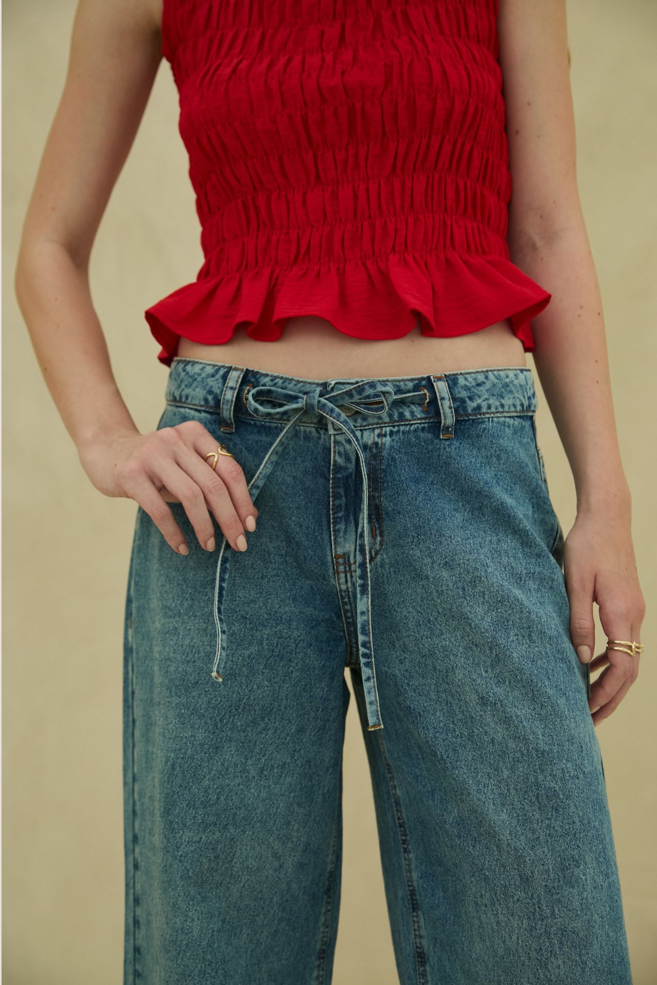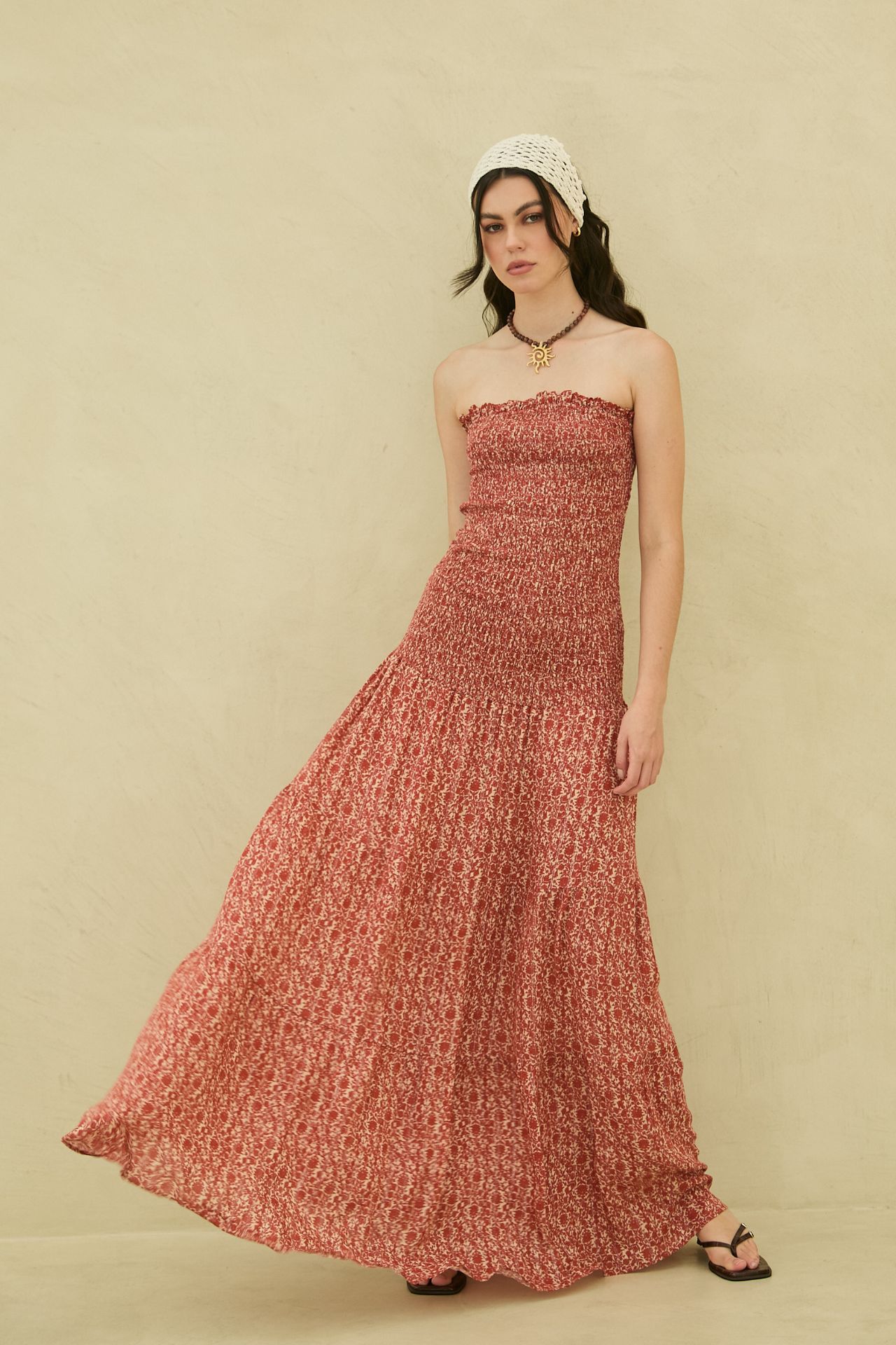 Maxi vestido holgado, la falda es en tiempos y tiene vuelo, lleva detalle fruncido de ‘bobito’ en el contorno del cuello y ojalillos metálicos que cruzan los pompones hechos a mano a tono del color del print. Las mangas son bombachas y tienen elástico.