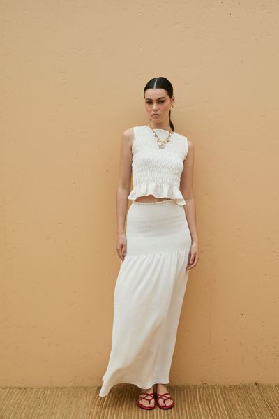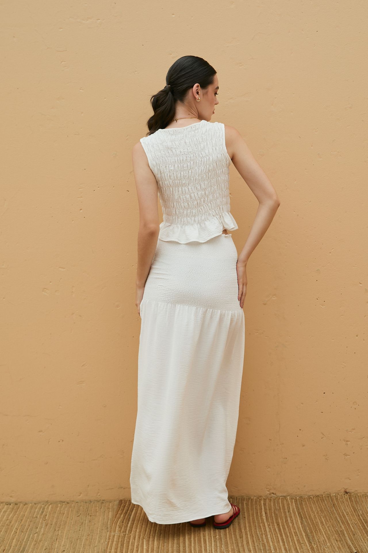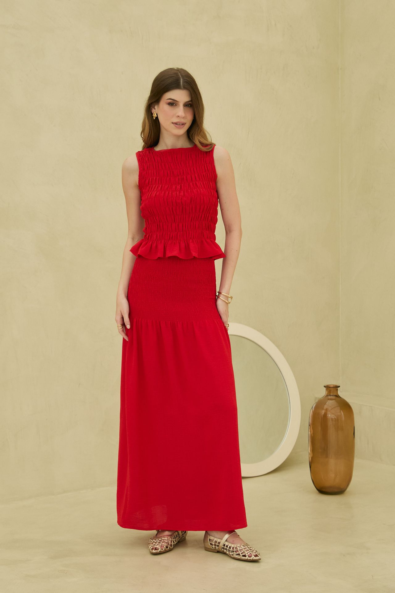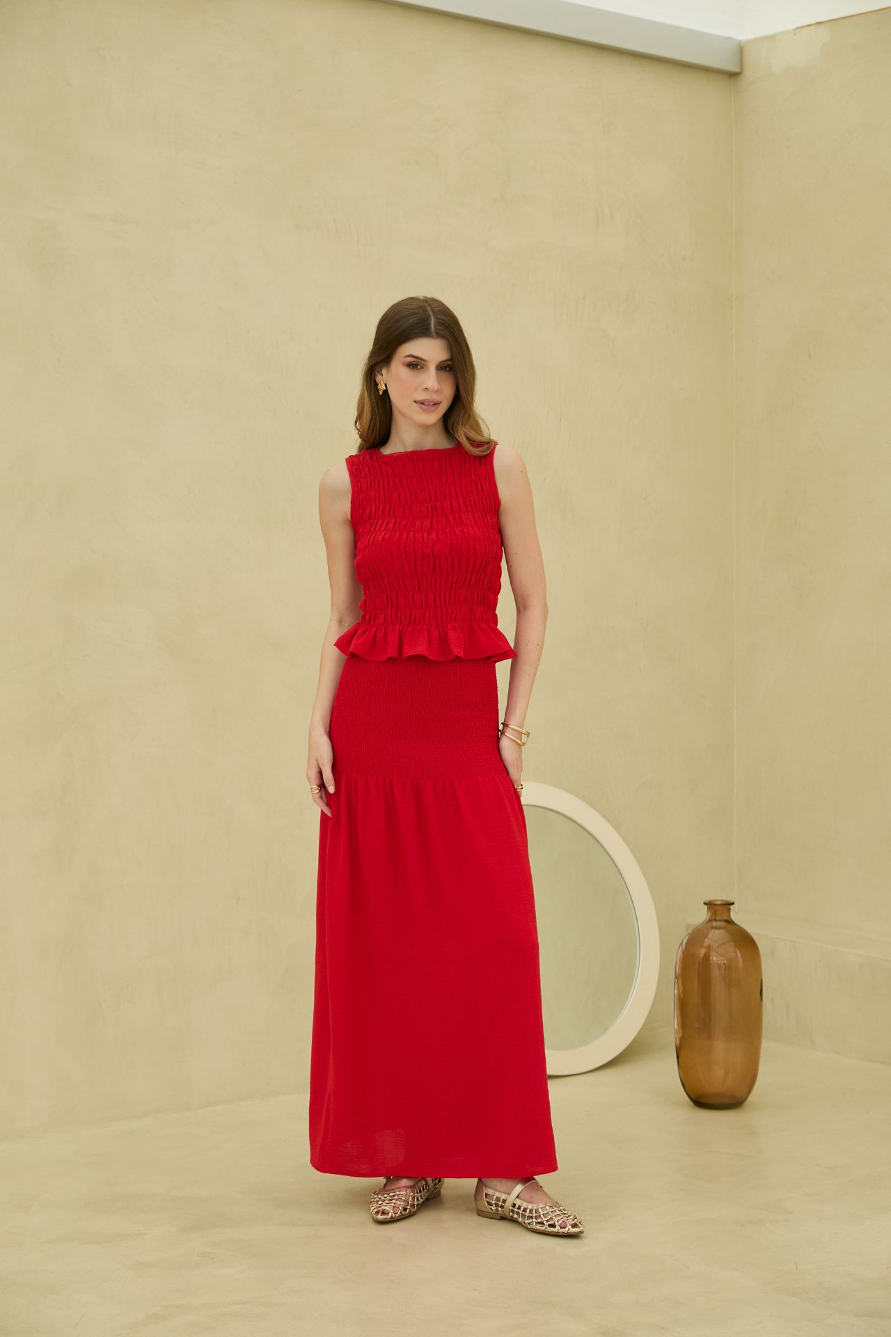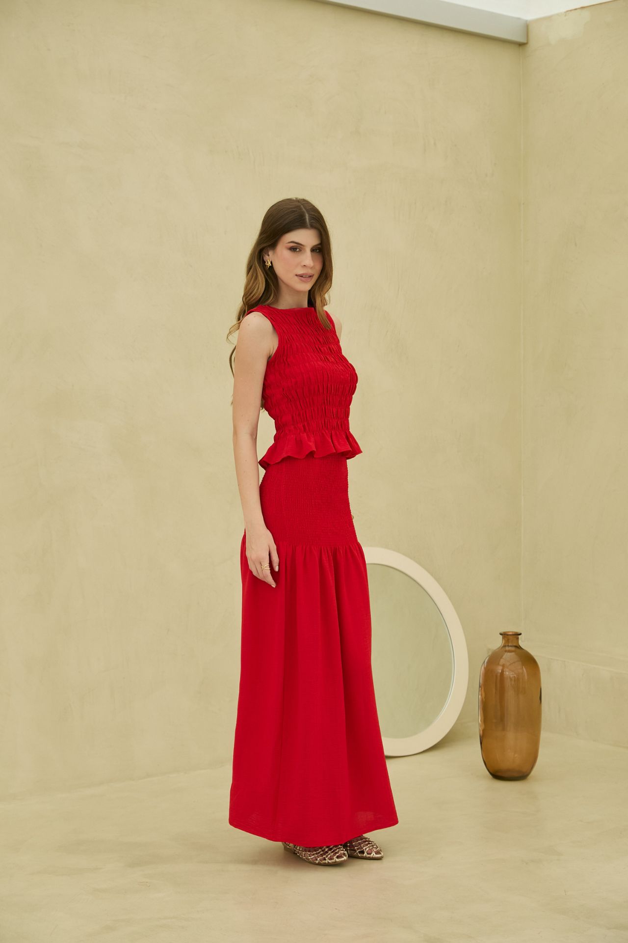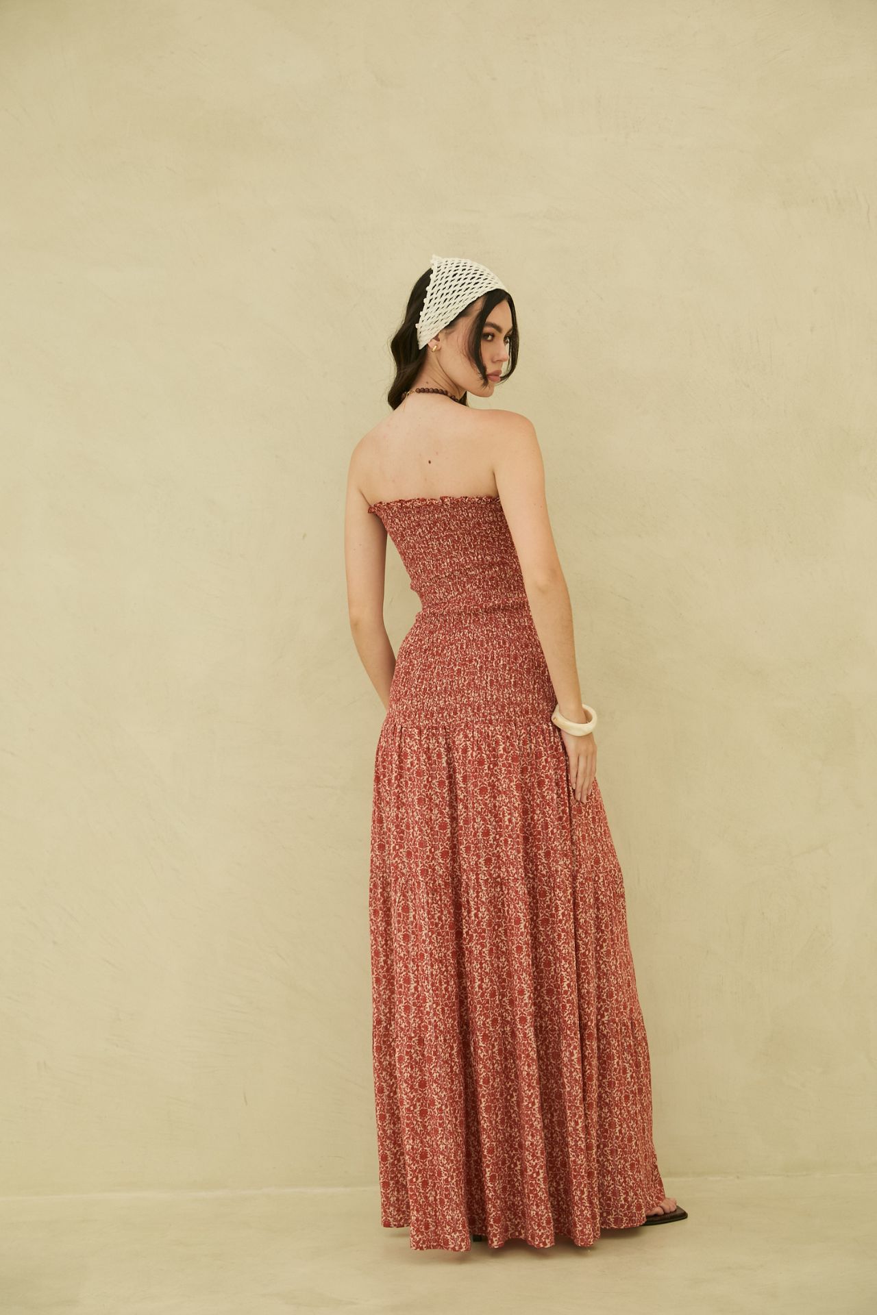 Maxi vestido de cuello halter para amarrar en el cuello, escote pronunciado en V. Lleva elásticos en el contorno de cintura para afinar la silueta, se adapta a todos los cuerpos.