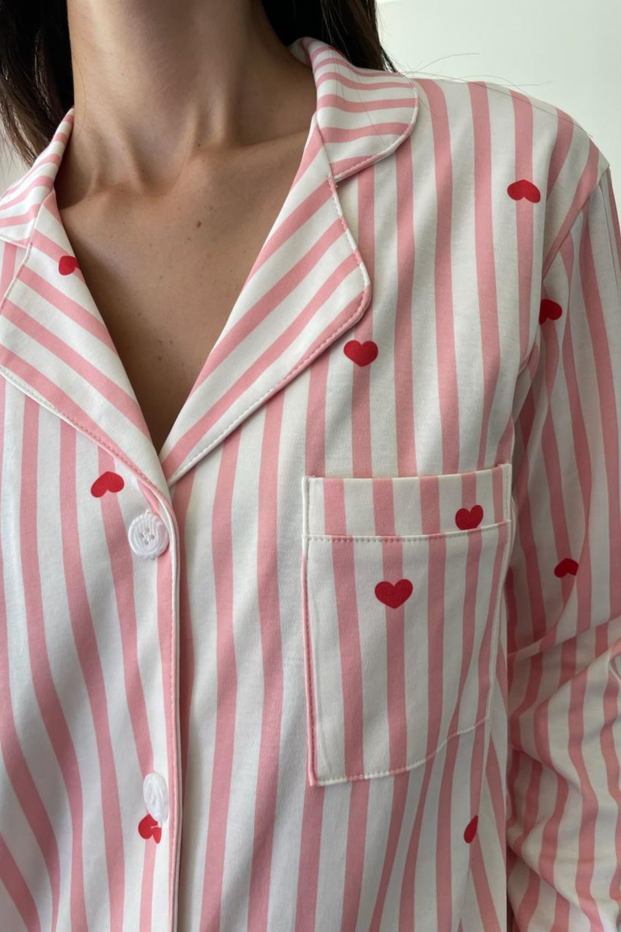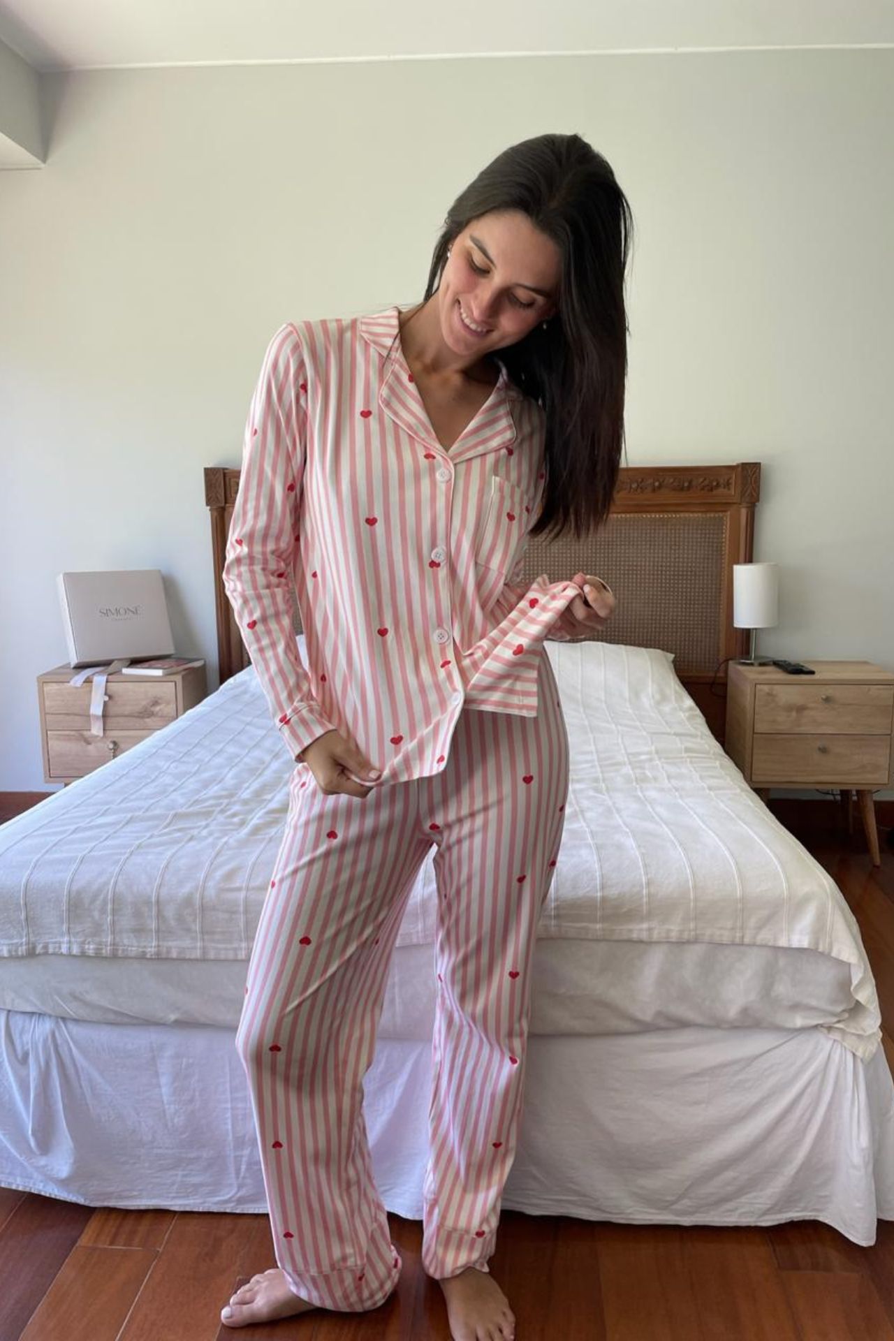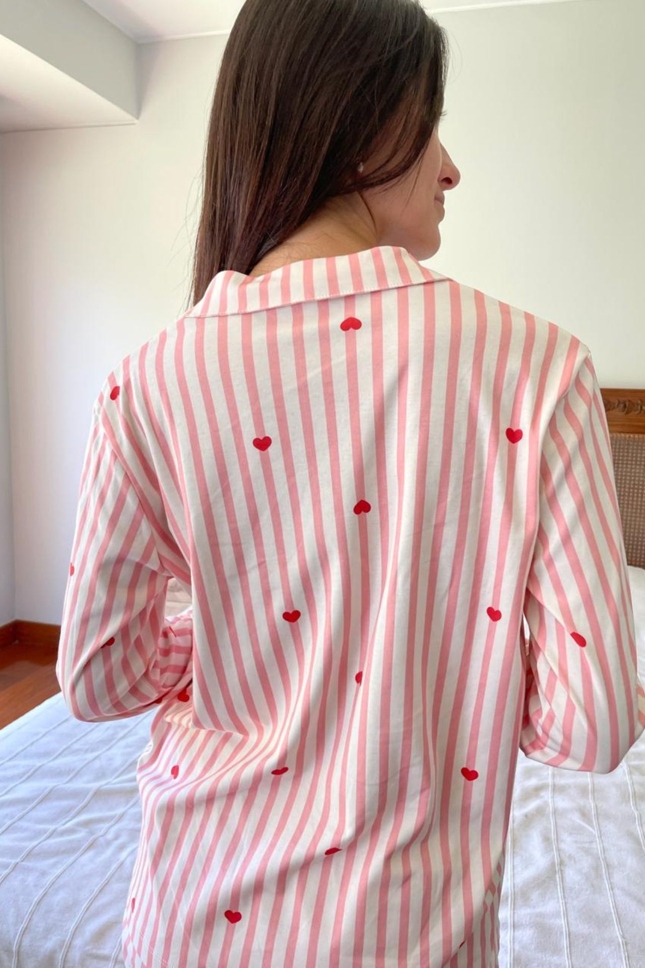 Nuestra Pij de algodón pima extra suave, ideal para descansar con total comodidad. Su diseño de rayas y pequeños corazones le da un toque romántico y divertido. Perfecto para noches relajadas, mañanas sin prisas y llenas de encanto.